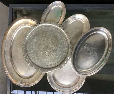Lotto di sei vassoi da portata in metallo argentato di differenti fatture...