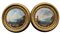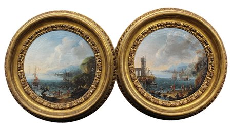 Maestro nordico attivo in Italia del secolo XVIII "Vedute portuali con rovine e velieri" coppia di dipinti ad olio su tela in tondo (d cm 37,5) in cornici (difetti)