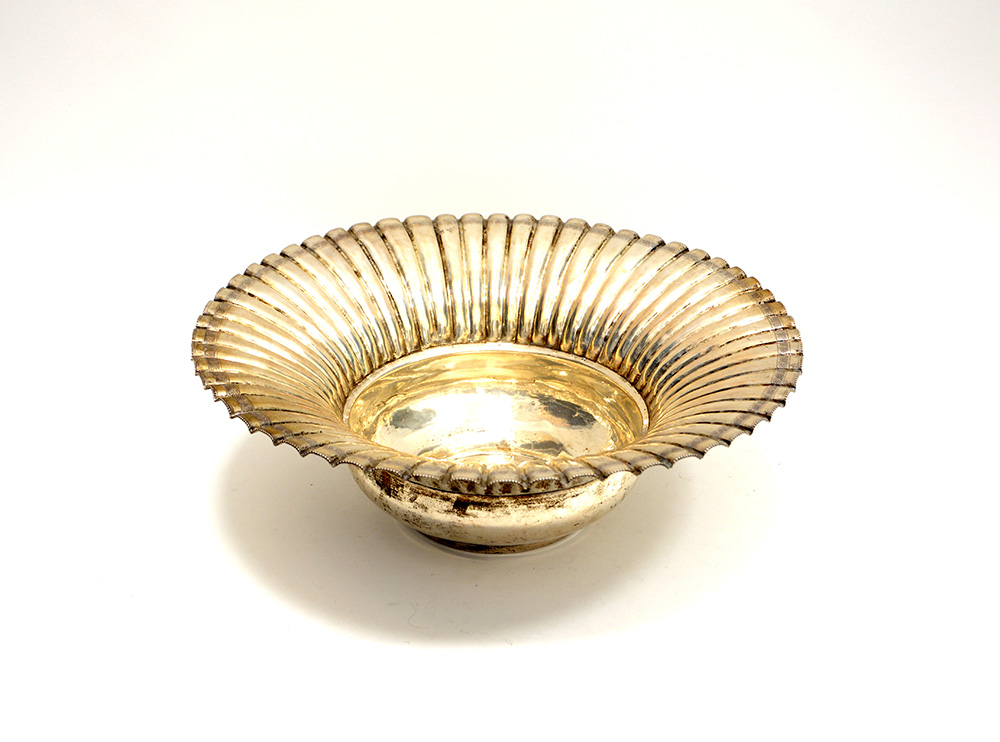 Centrotavola in argento con tesa costolata e bordo inciso, (gr 930) (d cm 34) (difetti)