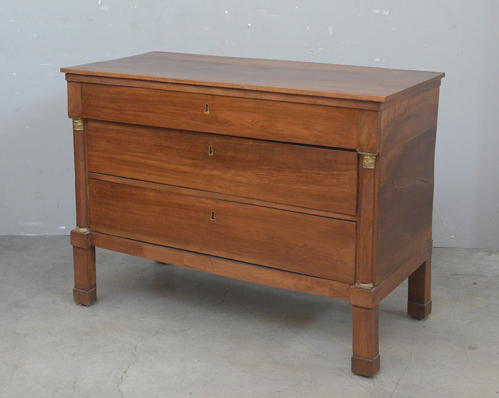 Comò impero in noce a due cassetti e mezzo con montanti a mezza colonna con capitelli intagliati, secolo XIX (cm 120x90x56)