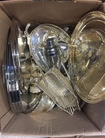 Lotto di un cartone contenenti numerosi vassoi e oggetti per la tavola in metallo argentato (difetti)