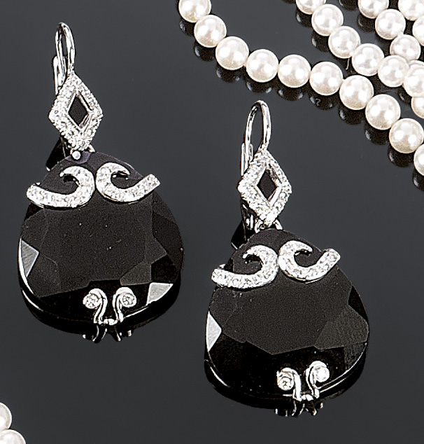 COPPIA DI ORECCHINI Coppia di orecchini in oro bianco con due gocce di onice sfaccettate pendenti e diamanti taglio brillante rotondo per complessivi ct 0,64 Peso gr. 15,8
