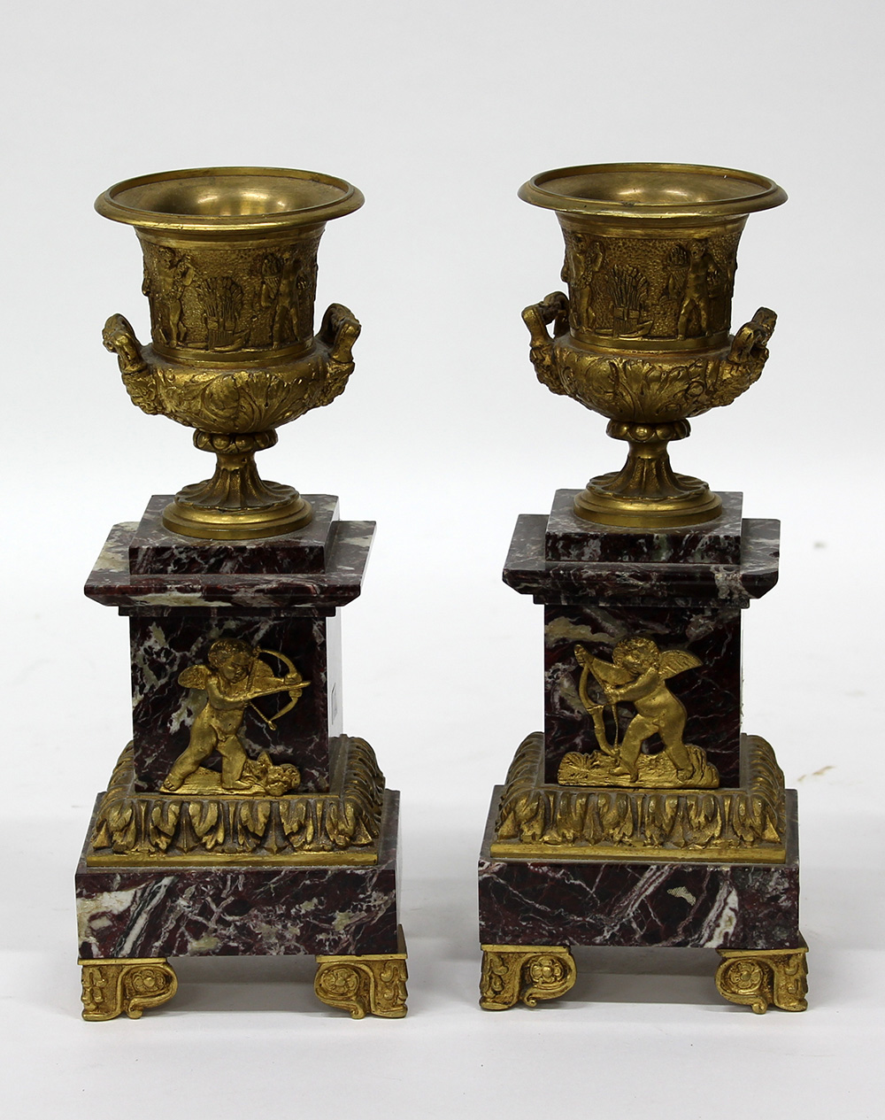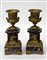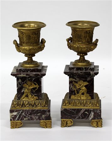 Coppia di elementi decorativi in marmo e bronzo, sormontati da vasi di forma...