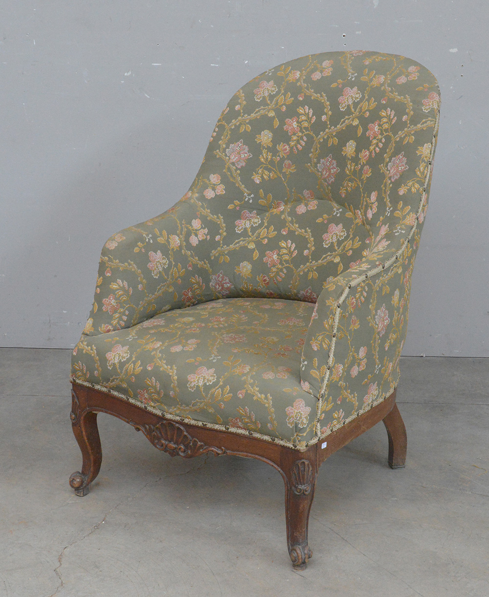 Poltroncina da camera in noce con gambe intagliate terminanti a ricciolo, secolo XIX