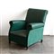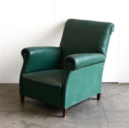 Poltrona di forma mossa rivestita in finta pelle verde con piedini in legno (difetti)