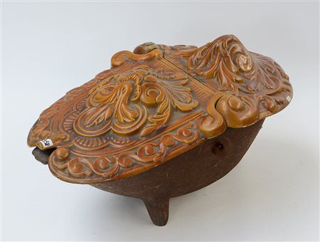 Braciere in metallo con coperchio smaltato marrone decorato a foglie e volute...