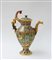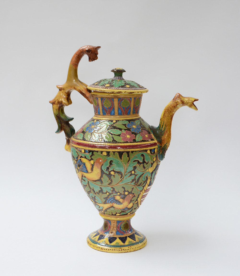 Grande brocca in ceramica con coperchio decorata in policromia con incisioni di foglie e fiori e volatili. Ansa e beccuccio ad animale fantastico. Secolo XX (h. cm 56) (difetti e restauri)