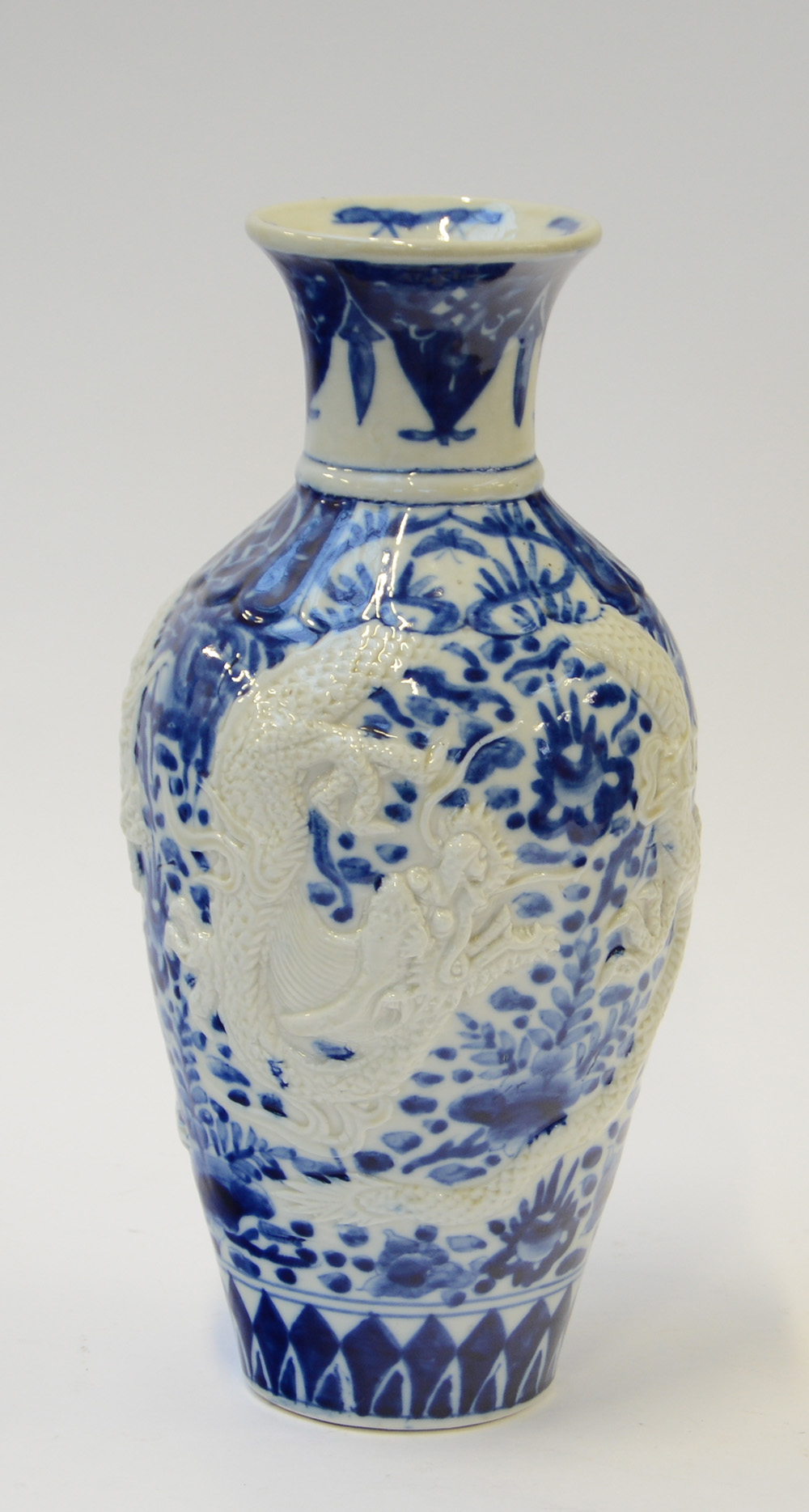 Vaso in porcellana bianco blu decorato sul corpo con dragone in rilievo, Cina, secolo XX (h. cm 37) (difetti)