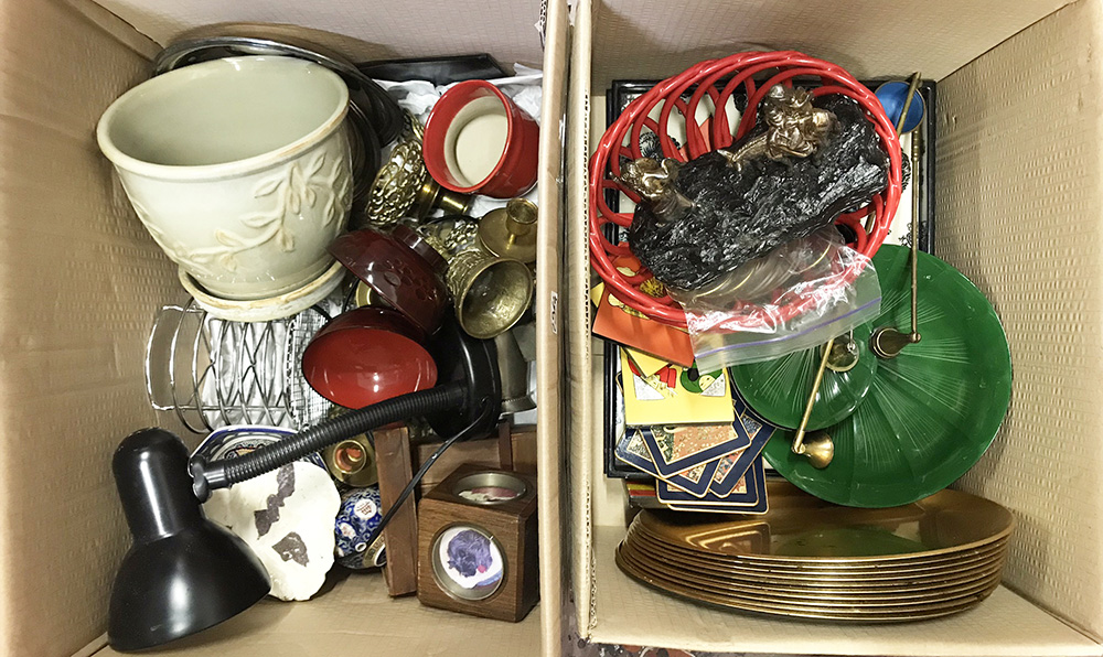Lotto di due cartoni contenenti numerosi oggetti di materiali ed usi differenti (difetti)