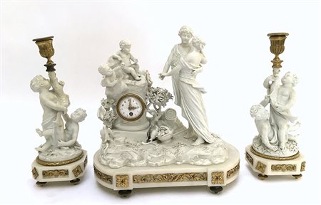Trittico da camino in biscuit composto da una pendola con quadrante smaltato a numeri arabi e una coppia di candelieri ad una fiamma. Decorato con putti e figure classiche a tutto tondo, base in marmo bianco e guarnizioni in metallo doratoa motivi vegetali, piedini in metallo dorato. Francia fine secolo XIX (difetti, restari e mancanze)