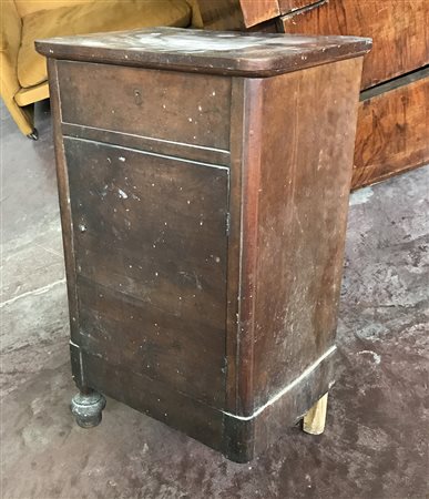 Lotto composto da un tavolino da lavoro ad un cassetto con gambe tornite e un comodino ad un'anta e un cassetto. Secolo XIX (difetti e mancanze)
