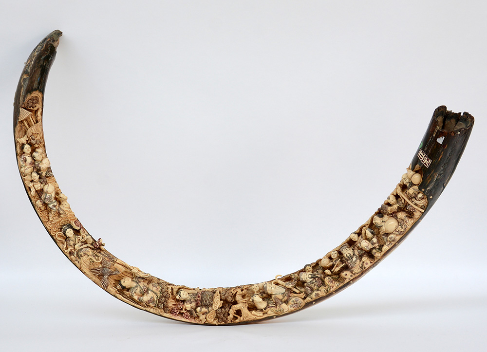 Zanna in avorio fossile scolpito con figure e animali (h.105 circa cm.)(difetti)
