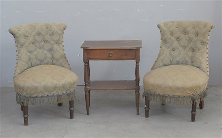 Lotto composto da una coppia di poltroncine da camera e un comodino (difetti)