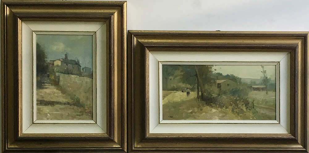 “Paesaggi” due dipinti ad olio su compensato, misure diverse, firmati, iscritti al retro, in cornici