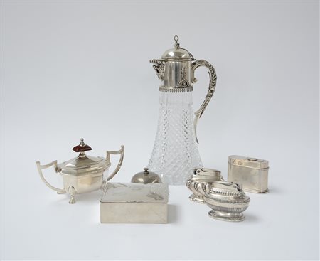 Lotto composto da una scatola in lamina d'argento decorata a conhiglie, tre accendini da tavolo e tre oggetti diversi in vetro e metallo (difetti)