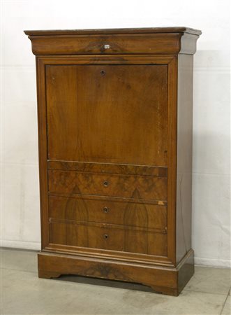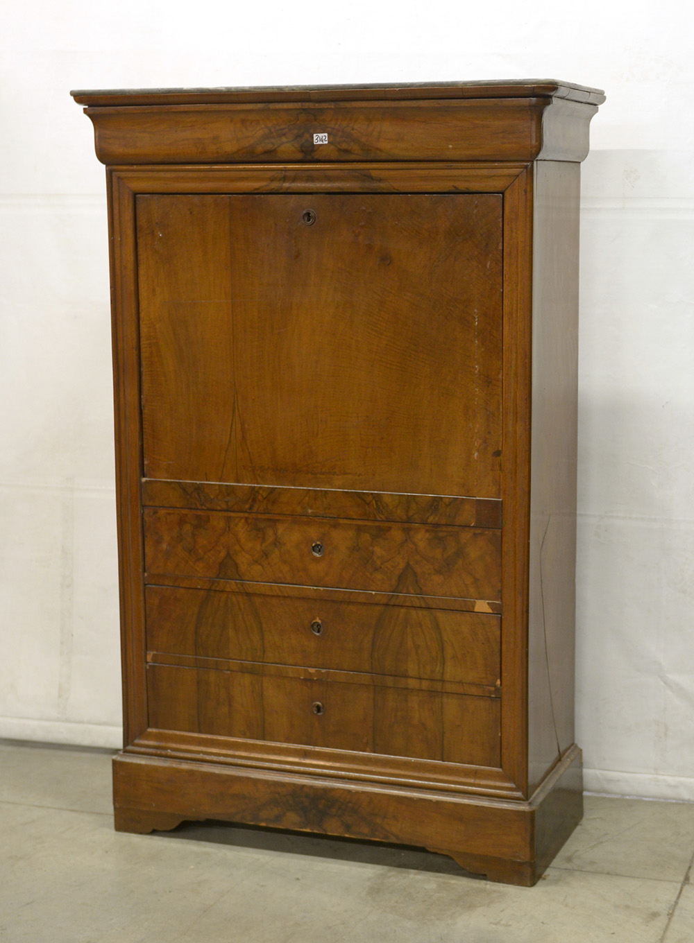Secretaire in noce a quattro cassetti, ribalta celante cassettini e vani a giorno, piano in marmo grigio. Fine secolo XIX (cm 97x149x36) (difetti)