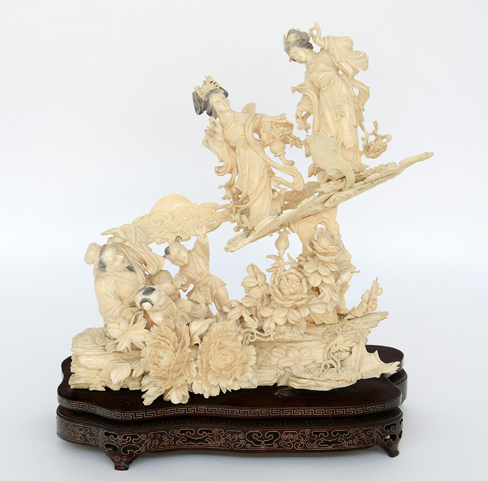 Giardino floreale con figure su base in legno (difetti e restauri) (l. 35...