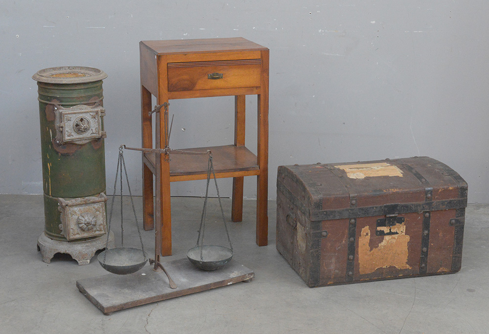 Lotto composto da un piccolo baule da viaggio, un'antica bilancia a due braccia, un comodino e una stufa a legna in ghisa color verde (difetti)