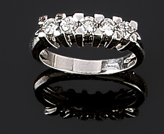 ANELLO Fedina in oro bianco con diamanti taglio brillante rotondo per complessivi ct 0,60 ca inseriti entro castoni quadrati elevati Peso gr. 7,1 Misura 14,5