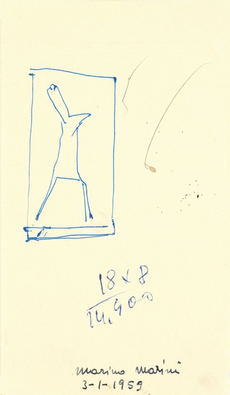 Marino Marini Pistoia 1901 - Viareggio 1980 Cavallo e cavaliere, 1959 Inchiostro su carta, cm. 22,8x13,3 Firma e data in basso al centro: Marino Marini / 3-1-1959. Certificato su foto Fondazione Marino Marini, Pistoia, 5 dicembre 2007, con n. 528.