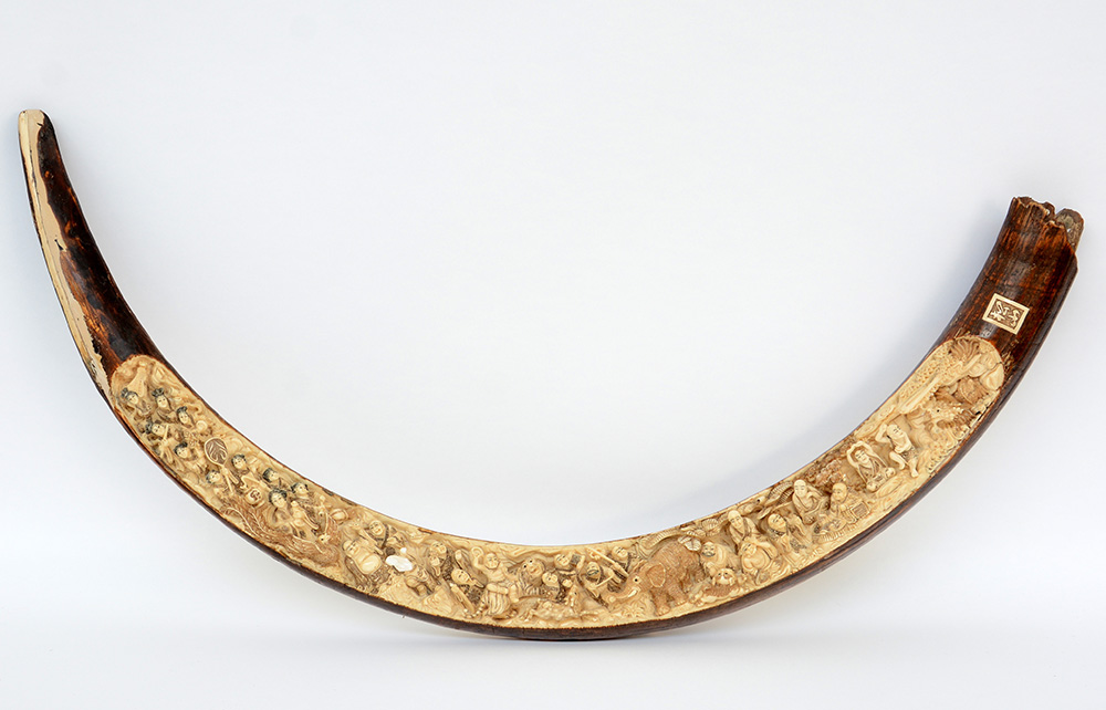 Zanna in avorio fossile scolpita con figure con base in legno (difetti, restauri e mancanze) (l. 84 cm.)