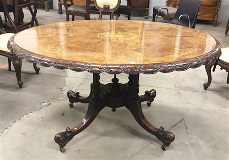 Tavolo ovale in legno intagliato, sostegno a quattro colonne e gambe mosse munite di rotelle. Piano "a vela" decorato con intarsi. Inizio secolo XX (cm 141x79x100)
