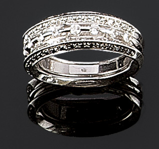 ANELLO Anello in oro bianco, a fascia, con al centro fila di nove diamantini taglio brillante rotondo, inseriti tra quattro file di diamanti taglio brillante rotondo di colore bianco e nero per complessivi ct 0,70 ca Peso gr. 10,6 Misura 13
