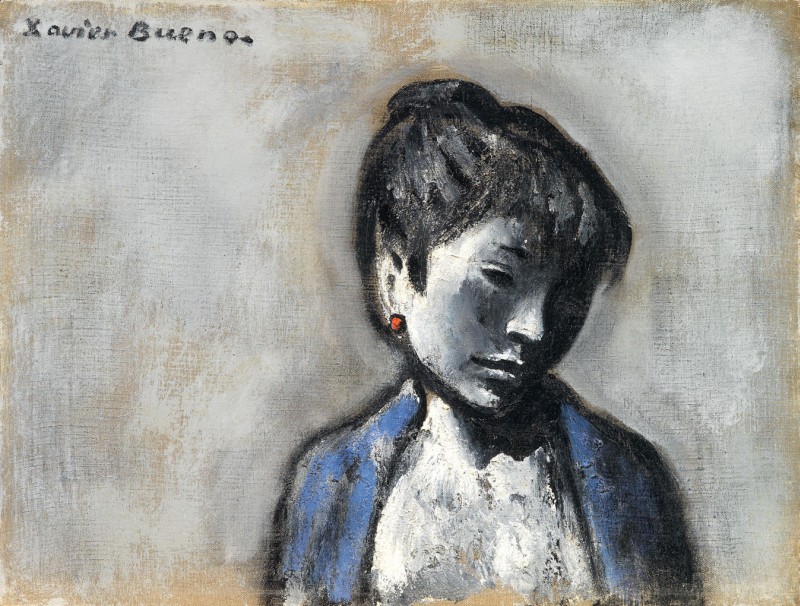 Xavier Bueno Vera de Bidesoa 1915 - Fiesole (Fi) 1979 Ragazza, 1966 Olio su cartone telato, cm. 30x39,8 Firma in alto a sinistra: Xavier Bueno; firma, titolo e data al verso: Xavier Bueno / "Ragazza" / 1966: timbro Galleria d'Arte Arno, Firenze: timbro Galleria d'Arte Moderna Arte Duomo, Firenze, con n. 382 - 203. Certificato su foto Xavier Bueno, Archivio Fotografico Generale delle Opere, in data 27/01/2010, con n. 014/2009.