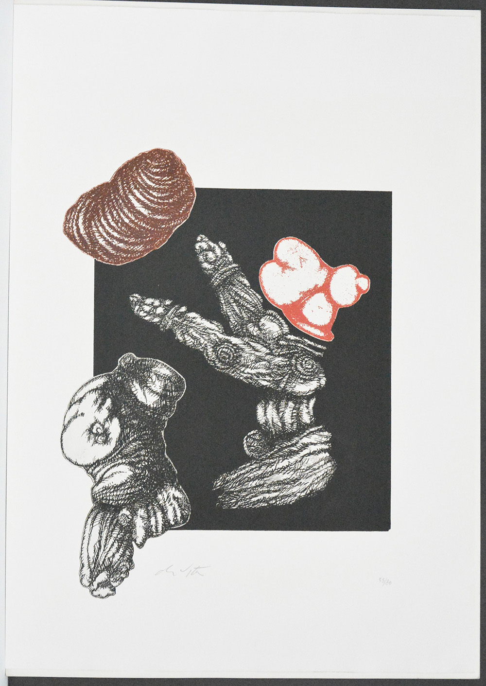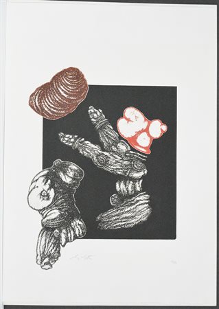 "Senza titolo" incisione a colori (foglio cm 69,5x49,5) firmata e numerata 53/80 in basso a matita. Edizioni della Pergola, Pesaro, 1976 (timbro a secco in basso a sinistra). Stampata su cartoncino della Cartiera Magnani di Pescia.