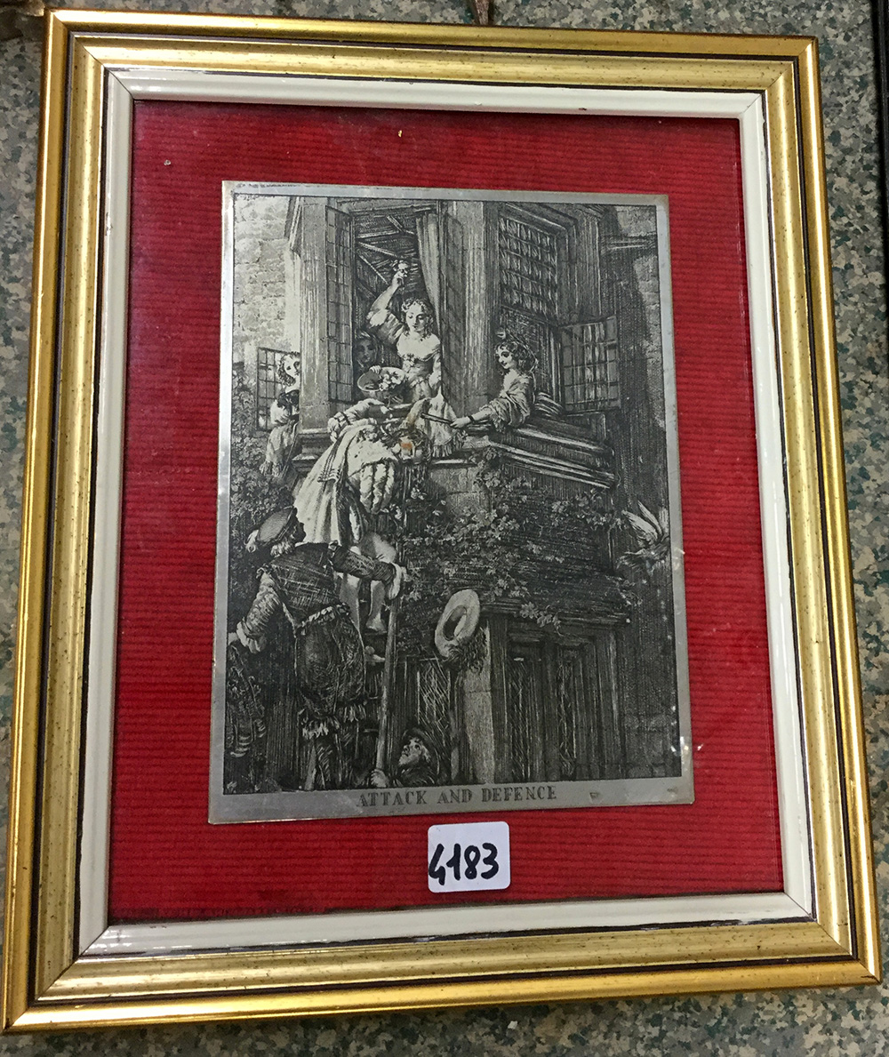 Lotto composto da cinque riproduzioni di diverso soggetto, tecniche e supporti differenti, una su lamina d'argento. In cornici (difetti)