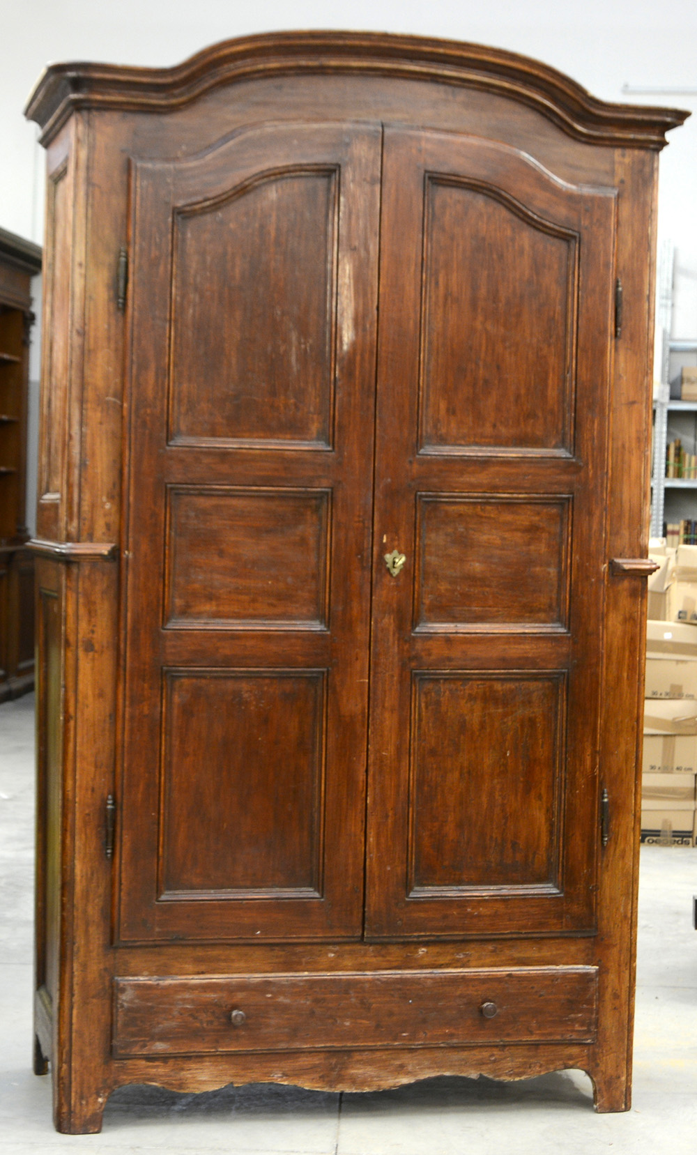 Armadio in legno dolce a due battenti riquadrati con cassetti nella fascia (cm 133x229x60) (difetti)