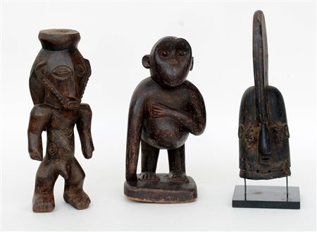 Arte africana, lotto di tre sculture in legno raffiguranti una scimmietta, una figura maschile e una maschera su piedistallo (h cm 40) (difetti)