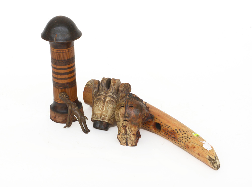 Arte africana, lotto composto da un contenitore in legno intagliato, un dente, due sculture in osso raffiguranti volti e una statuina in bronzo con figura maschile (difetti)