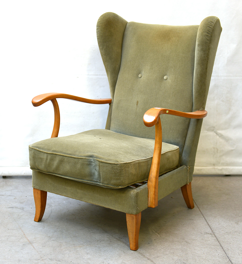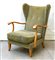 Bèrgere con struttura in legno chiaro massello rivestimento in velluto verde. Italia, anni '50. (difetti)