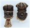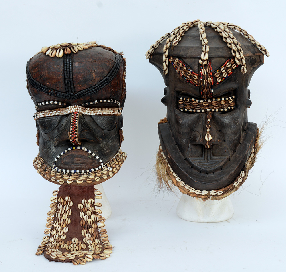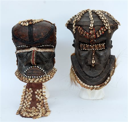 Arte africana, lotto di due maschere casco “Bwoom” (Kuba) in legno e pigmenti, decorate con fibre vegetali, cauri, perline, rame e pelo animale