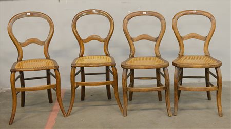 Lotto composto da due coppie di sedie con schienali a giorno e sedute incannucciate (difetti)