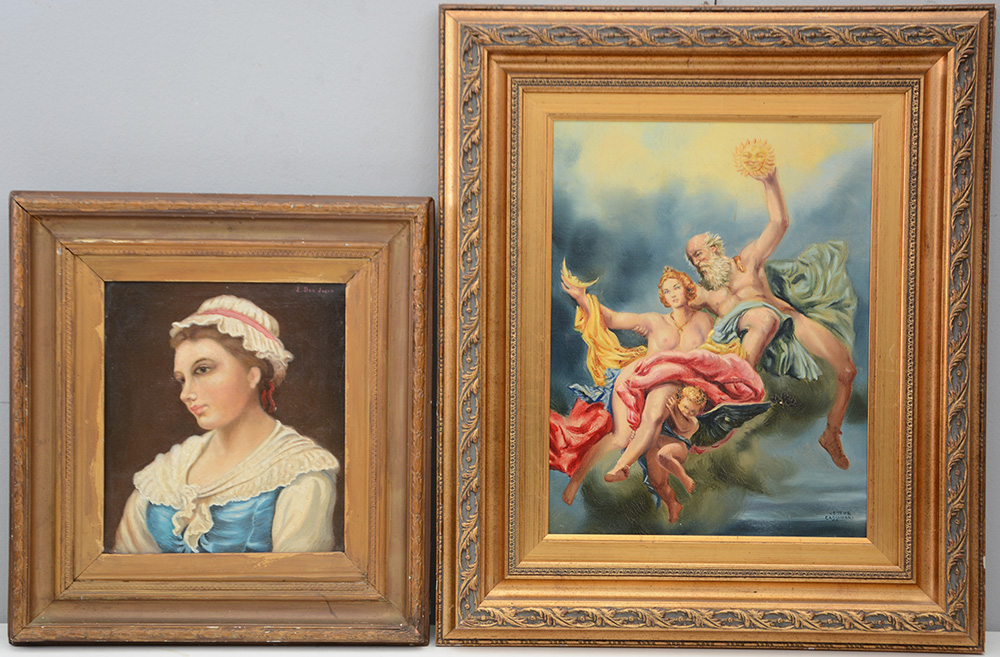 Lotto composto da due dipinti ad olio su tela di soggetti e misure diverse, in cornici (difetti)