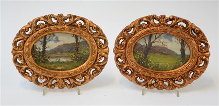 Due piccoli dipinti di paesaggi a olio su cartoncino di forma ovale (cm 9,4x13,5) In cornici dorate. Inscritti al verso