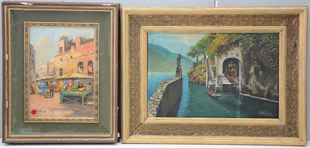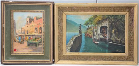 Lotto composto da due dipinti raffiguranti paesaggi di misure diverse, in...