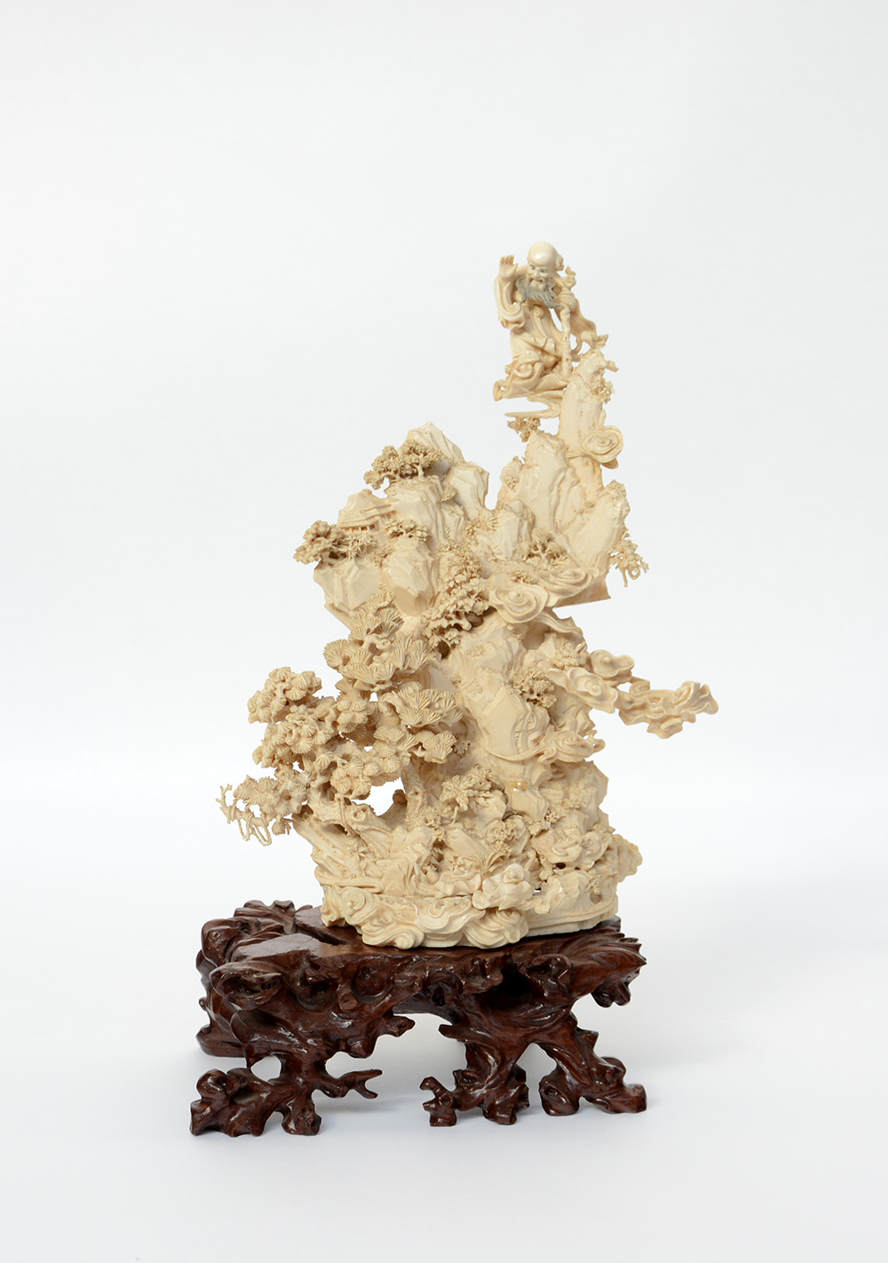 Gruppo in avorio scolpito in sezioni raffigurante guerrieri ed altre figure con base in legno (h. 37 cm.) (difetti)
