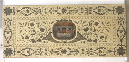 Ricamo in fili d'argento su taffetà di seta color crema. Decorato da due cornucopie con rami fioriti, uva e spighe di grano contornano un medaglione dipinto su seta raffigurante l'ultima cena (cm 215x92) (lievi difetti)