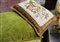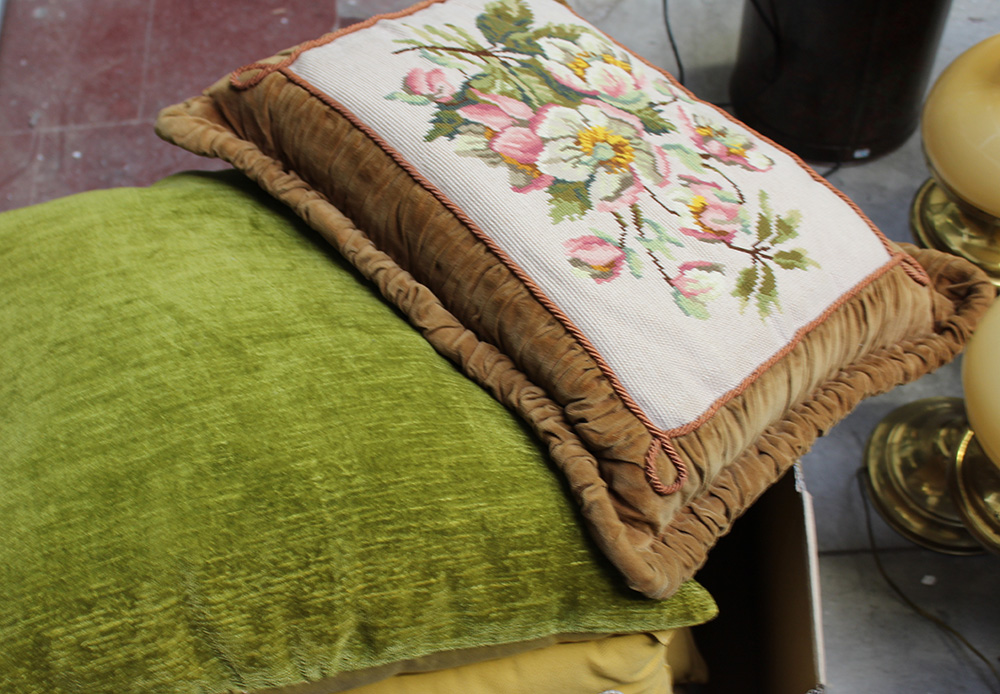 Lotto composto da un cestino gettacarte e un porta riviste rivestiti in tessuto, e un cartone contenente diversi cuscini confenzionati con pizzi all'uncinetto e piccolo punto (difetti)
