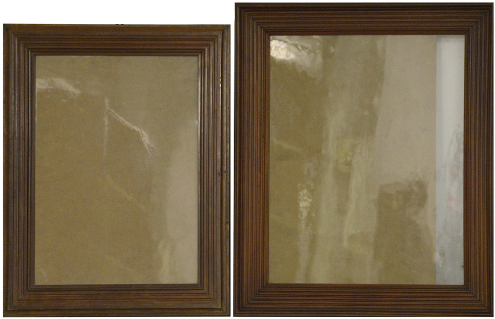 Lotto di due cornici rettangolari in noce decorate a scanalature, fine secolo...