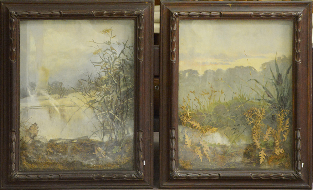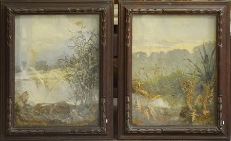 Coppia di diorami della fine del secolo XIX decorato a paesaggi, in cornici...