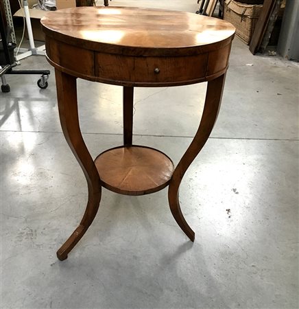 Tavolino tondo tripode in legno con cassetto sottopiano, gambe mosse riunite...