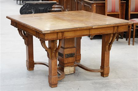 Tavolo "Liberty" allungabile a cinque gambe a pilastro, di cui quella centrale decorata da placchette in metallo, inizio secolo XX (cm 120x77x126)(difetti e mancanze)
