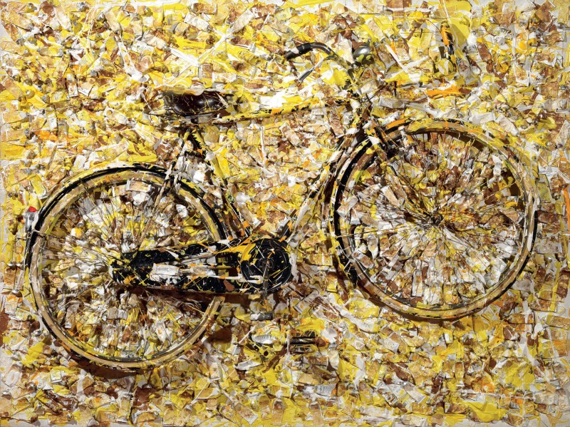 Arman (Armand Pierre Fernandez) Nizza 1928 - 2005 Senza titolo Acrilico, assemblaggio di bicicletta e tubetti su tela tesa su compensato, cm. 150,5x200,5x31 Firma sul risvolto della tela: Arman.