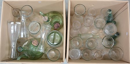 Due cartoni contenenti numerose misure da vino e altri oggetti in vetro di diverso uso (difetti)