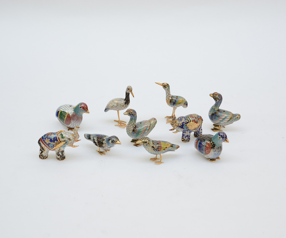 Lotto composto da otto sculturine in metallo cloisonné raffiguranti volatili e due raffiguranti elefanti (lievi difetti)