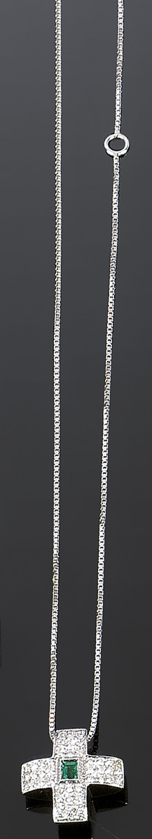 CATENA CON CIONDOLO Catena e ciondolo in oro bianco a forma di croce bombata, sommità in diamanti taglio brillante rotondo per complessivi ct 0,50 ca e al centro smeraldo taglio rettangolare Peso gr. 6,7